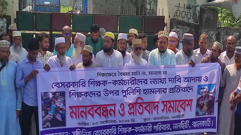 শিক্ষাক্ষেত্রে চলমান বৈষম্য, বেসরকারি শিক্ষক-কর্মচারীদের ন্যায্য দাবির প্রতি সরকারের অবহেলা এবং শিক্ষকদের ওপর পুলিশি হামলার প্রতিবাদে ঝালকাঠির নলছিটিতে মানববন্ধন ও প্রতিবাদ সমাবেশ অনুষ্ঠিত হয়েছে।